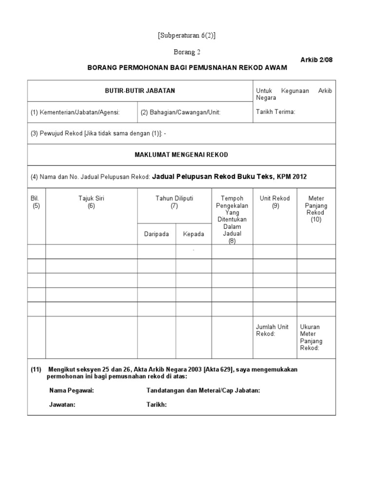 Lampiran 2 contoh arkib 2 08 borang permohonan bagi pemusnahan rekod awam. Bersama ini disertakan. 2 1 borang permohonan bagi pemusnahan rekod awam arkib 2 08 buku teks. Tahun 1 6 bulan 50 1 m p 3 buku teks spbt pendidikan islam tahun 2 6 1 tahun 150 3 m p buku teks spbt pendidikan islam tahun 1 6 bulan 50 1 m p jumlah unit rekod.