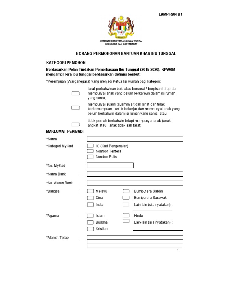Borang bantuan khas ibu tunggal lampiran b1. Semakan bantuan ibu tunggal semakan bantuan ibu tunggal. Dokumen asal salinan kad pengenalan. Bagi memohon bantuan khas ibu tunggal bkit bantuan rm300 anda perlu mengisi borang permohonan bkit mengikut negeri masing masing secara online. Terbaru anda boleh dapatkan rm300 dari kementerian pembangunan wanita keluarga secara one off sebelum hari raya aidilfitri.