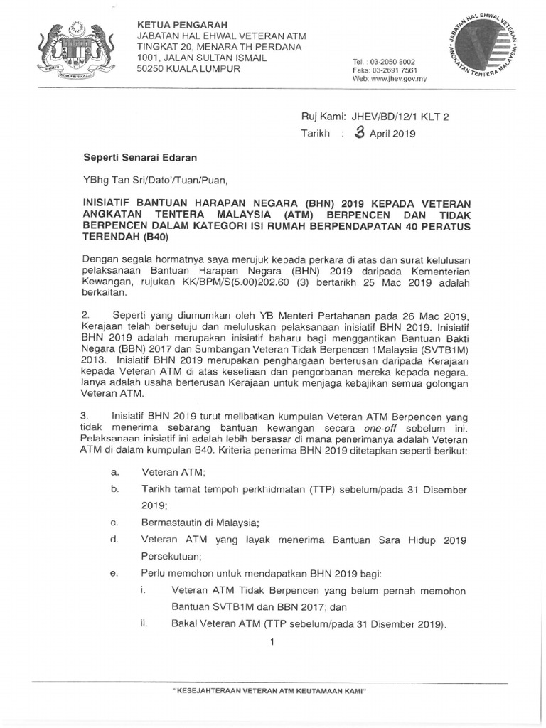 Urus setia bhn 2019 bahagian pencen unit inspektorat tingkat 15 menara th perdana 1001 jalan sultan ismail 50250 kuala lumpur tel. Veteran yang mempunyai jumlah pendapatan isi rumah kasar bulanan rm 4 000 dan ke bawah b40. Meringankan beban kewangan ketahui bantuan untuk mengurangkan beban kewangan anda. Bakal veteran atm ttp sebelum pada 31 disember 2019.