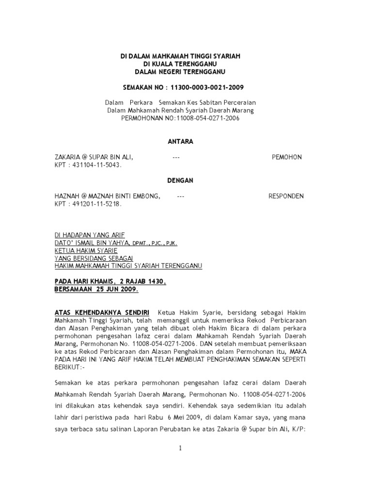 Jabatan hal ehwal agama terengganu bahagian undang undang pentadbiran keluarga islam. Sebarang pertanyaan berkaitan nikah cerai dan rujuk negeri terengganu. Hakim syarie mengikut ketetapan seksyen 21 enakmen undang undang pentadbiran keluarga islam terengganu bil 12 tahun 1985. Dengan ini pihak lelaki.