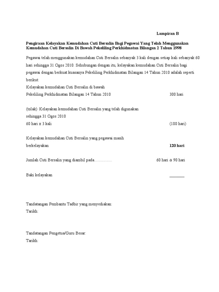 Cuti bersalin pegawai hendaklah mengambil cuti bersalin antara 60 hingga 90 hari dengan menggunakan kemudahan berikut. 1 lampiran b jpa saraan 223 5 4 3 jld. Permohonan cuti bersalin hanya akan diproses setelah pihak kami menerima surat akuan bersalin daripada klinik hospital kerajaan atau swasta. Maklumat hendaklah dilengkapkan dengan jelas dan menggunakan huruf besar perakuan bersalin surat.