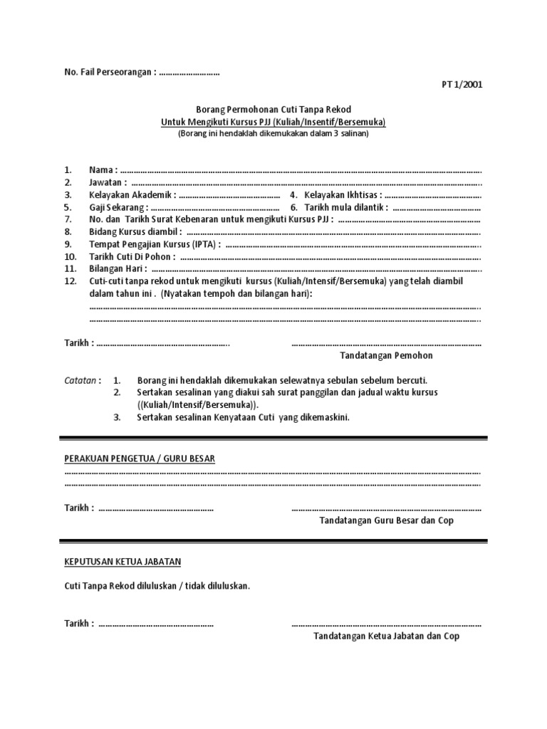 Cetak dan isi borang permohonan cuti dan sokongan memangku untuk pegawai dan kakitangan dalam jabatan kerajaan kementerian jabatan. Borang untuk menghadiri peperiksaan bagi tujuan mendapat cuti tanpa rekod 1. Hendaklah diisi dan ditandatangani ringkas sebelum borang diserahkan kepada pemohon. Pegawai pentadbiran hendaklah diisi dalam 2 salinan borang perlu diisi sebelum bercuti.