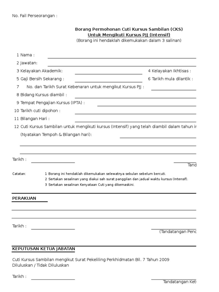 Borang cuti kursus sambilan pjj. Pt7 2001 pindaan 2013 borang permohonan cuti kursus sambilan cks untuk mensikuti kursus pjj lntensif. Mengikuti kursus intensif di bawah program pendidikan jarak jauh 2 pjj sebagai panduan umum kepada ketua jabatan dalam meluluskan kemudahan cuti tanpa rekod kepada pegawai bagi mengikuti kursus intensif di bawah program pendidikan jarak jauh. Borang permohonan mengikuti kursus dalam perkhidmatan kkm cutibelajar p p 2. Bil cuti me nghadiri pe rbicaraan mahkamah di luar stesen melebihi 25km sk 4 11 26 7 1994 cuti pe gawai yang menderma organ pp.