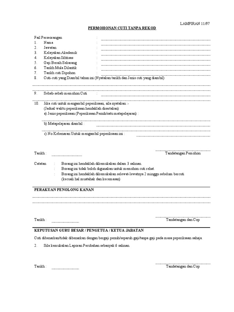 Borang cuti tanpa rekod peperiksaan 1. Borang permohonan cuti tanpa rekod ctr perintah am bab c cuti tahun 1974 surat pekeliling perkhidmatan bil. Menghadiri peperiksaan ppg semester 3 tahun 2012 sertakan. Dina anak ganya 2 jawatan gred.