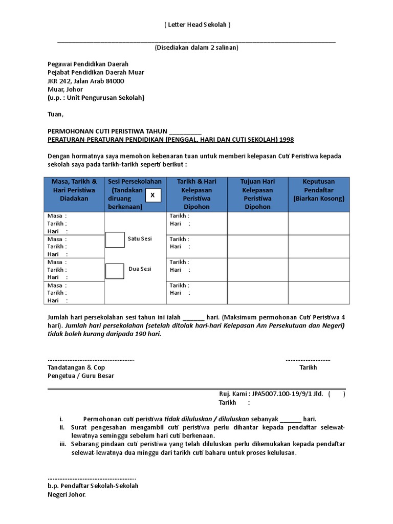 Dari hasil rapat tingkat menteri di kemenko pmk senin 9 3 diputuskan tambahan empat hari cuti bersama untuk 2020. Contoh surat permohonan cuti peristiwa rujukan sekolah. Tarikh berikut mungkin diubah suai. Sila semak laman web ini untuk maklumat terkini.