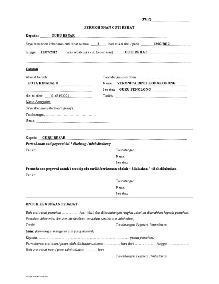 Huruf besar. Keterangan mengenai cuti yang diambil kepada. 100 100 menganggap dokumen ini bermanfaat tandai dokumen ini sebagai bermanfaat. 09 9758509 permohonan cuti rehat kepada.