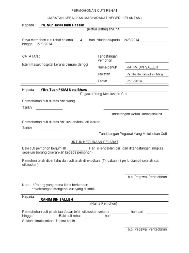 Nama pemohon permohonan cuti tuan puan telah diluluskan selama hari dari hingga baki cuti rehat hari. Borang sijil sakit 5. Borang permohonan cuti tanpa rekod 4. Borang permohonan bantuan kewangan jabatan kebajikan masyarakat.