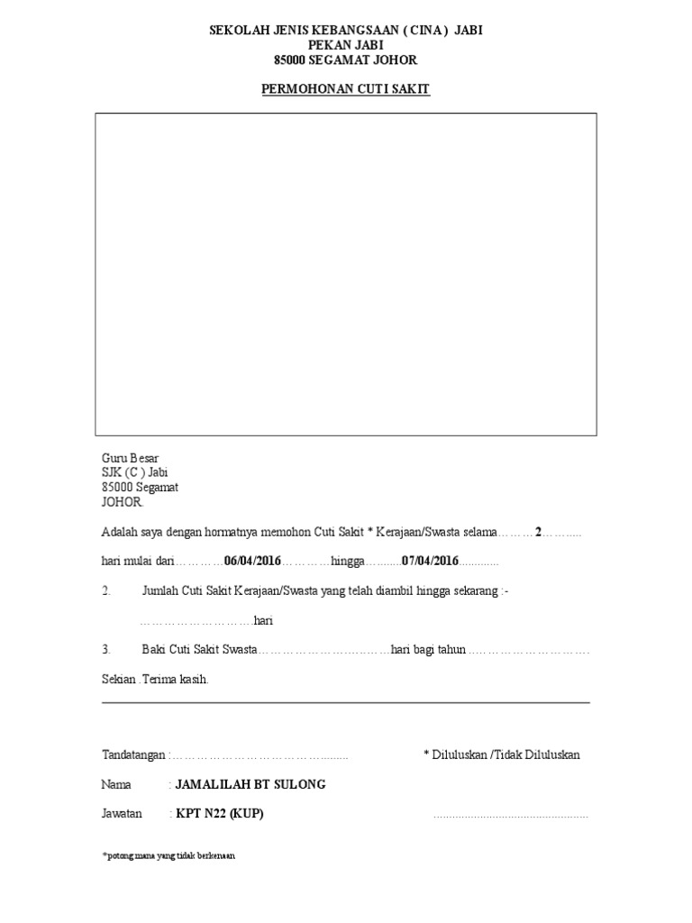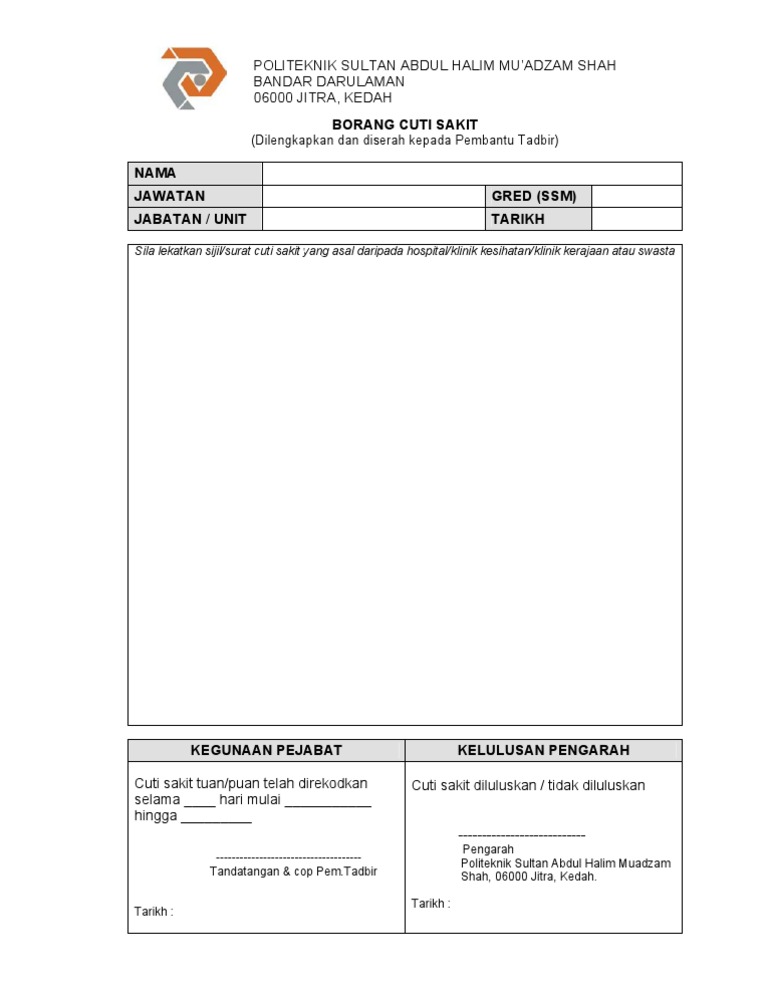 Borang cuti sakit kerajaan. Borang meninggalkan pejabat muat turun. Pekeliling perkhidmatan ini bertujuan untuk melaksanakan keputusan kerajaan berhubung kemudahan cuti bersalin kepada pegawai perkhidmatan awam. Http www ilkap gov my download pekeliling ilkap arahankpbil1 2014 pdf. Cuti tibi kusta dan barah 1.