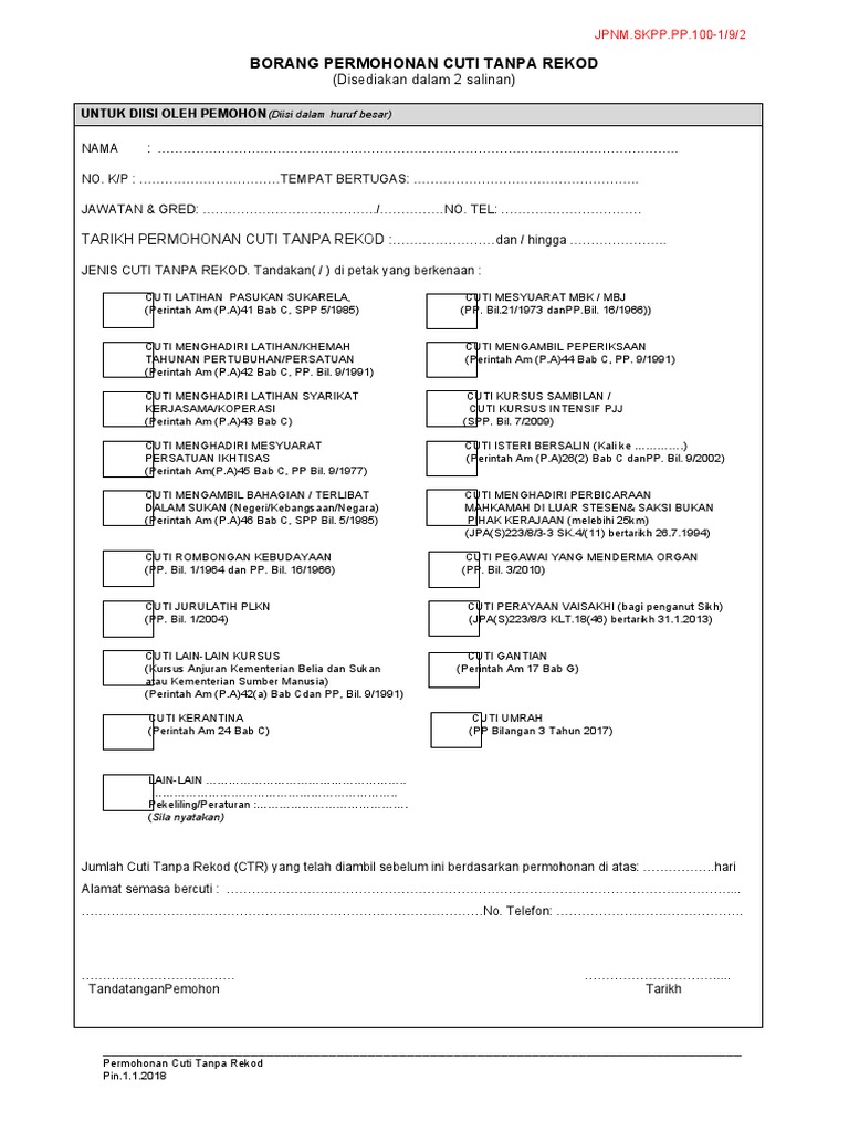 Borang kemas kini ogos 2017 1 borang permohonan cuti tanpa rekod ctr bagi urusan kematian ahli keluarga terdekat pekeliling perkhidmatan bilangan 4 tahun 2015 arahan. Perintah am bab c cuti. Borang permohonan cuti isteri bersalin author. Permohonan cuti tanpa rekod untuk suami bagi isteri bersalin pp bil.