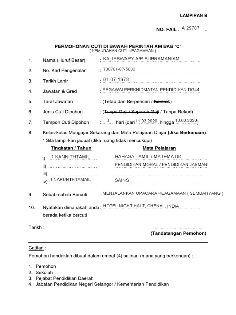 Borang cuti tanpa rekod keagamaan. Tarikh ctr tempoh ctr tujuan ctr. Https docs jpa gov my docs spp 2016 spp022016 pdf. Borang cuti keagamaan bukan islam hebahan pemanjangan cuti tanpa rekod pdf. Cuti keagamaan tertakluk kepada maksimum tujuh 7 hari tidak termasuk hari rehat mingguan hari kelepasan mingguan dan hari kelepasan am.