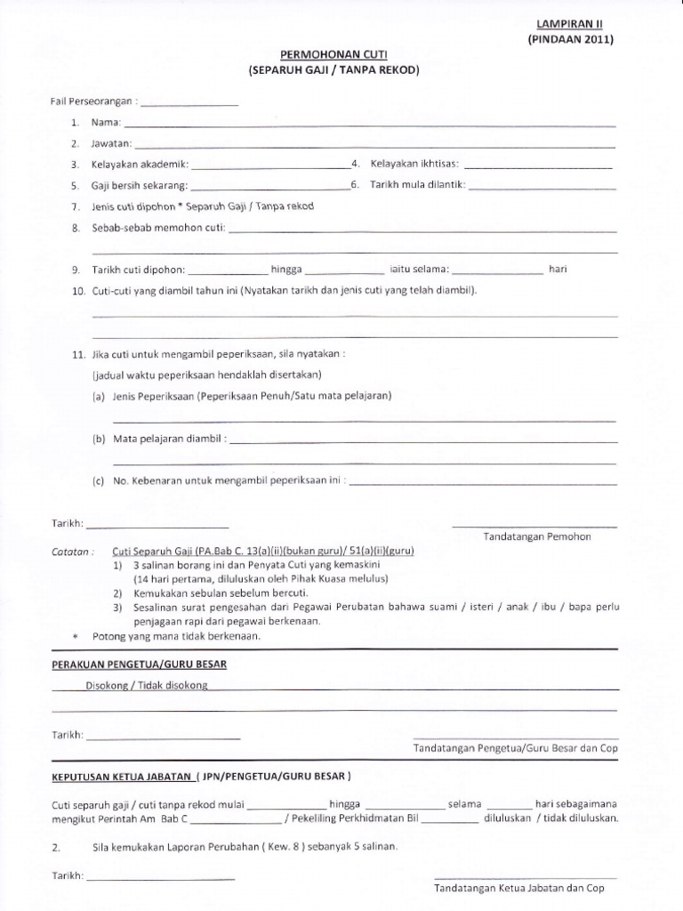 Borang cuti tanpa rekod lampiran ii pindaan 2011. Dibaca bersama akta pencen pindaan 2011 akta pencen pihak berkuasa berkanun dan tempatan 1980 akta 239 dibaca bersama akta pencen pihak berkuasa berkanun dan tempatan pindaan 2011. Selama tujuh 7 hari cuti tanpa rekod. Cuti tanpa rekod dan bergaji penuh bagi menjalani program latihan khidmat negara plkn 23. Lampiran ii pindaan 2011 permohonan cuti separuh gaji tanpa rekod fail perseorangan.