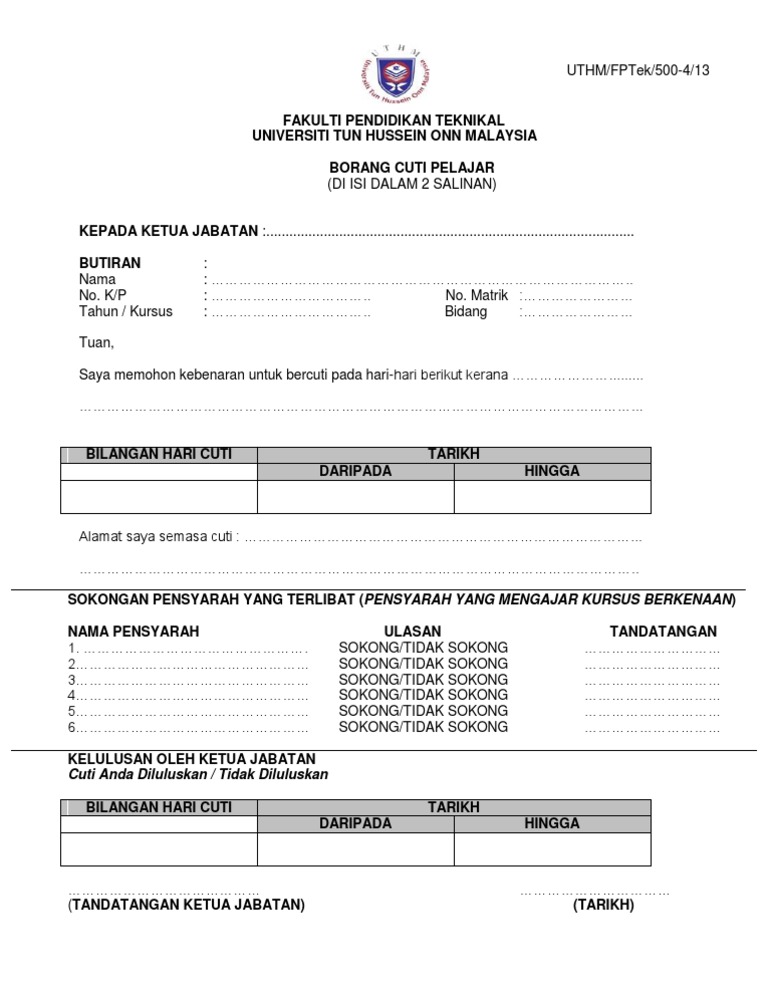 Borang cuti uthm. Permohonan kemasukan ke uthm. Uthm fptv 500 4 13 kepada ketua jabatan to head of dept. Perakuan syarat pengesahan dalam perkhidmatan staf akademik uthm. Saya dengan ini mengesahkan bahawa staf ini telah hadir untuk bertugas pada dan yang demikian permohonan cuti yang telah diluluskan sebelum ini adalah dibatalkan.