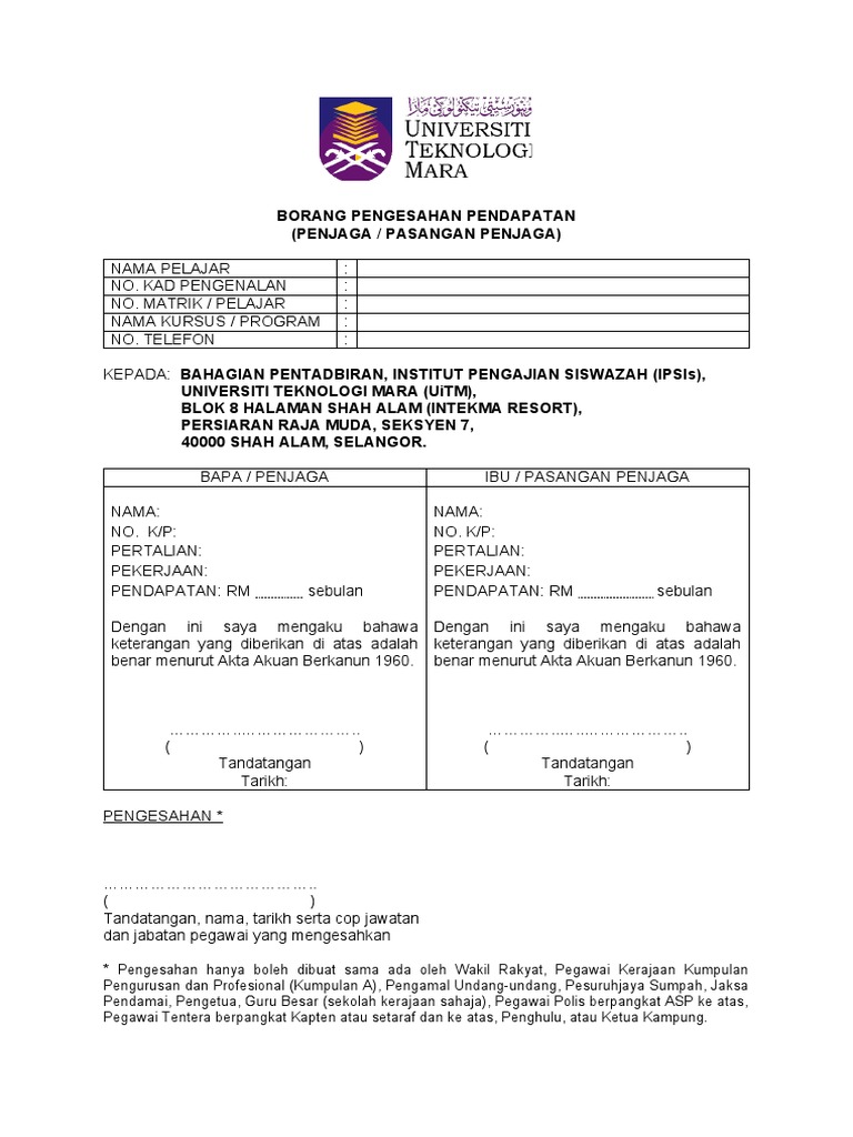 Borang d pengesahan akuan pendapatan uitm. 1 2 semester 6 12 bulan. Bil nama hubungan umur sek kolej ipt bahawasanya saya mengaku semua maklumat yang diberikan di atas adalah benar dan sekiranya didapati maklumat. Borang pengesahan akuan pendapatan rujukan. Universiti teknologi mara 40450 shah alam.