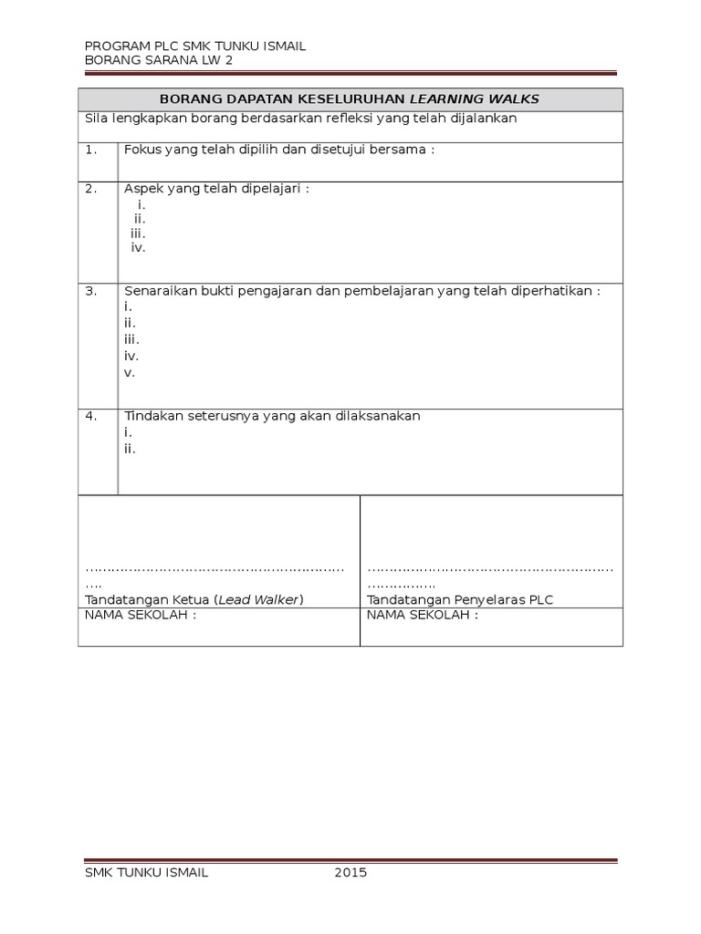 Borang pemerhatian boleh gunakan google form learning walks daripada pentadbir. Borang sarana lw 3 borang dapatan keseluruhan learning walks sila lengkapkan borang berdasarkan refleksi yang telah dijalankan. Lawatan bilik darjah classroom visit 3. Dapatan learning walk sebaik melangkah meninggalkan kelas antara fokus perbincangan sesama ahli yang melakukan learning walk sewajarnya berkisar tentang sama ada.