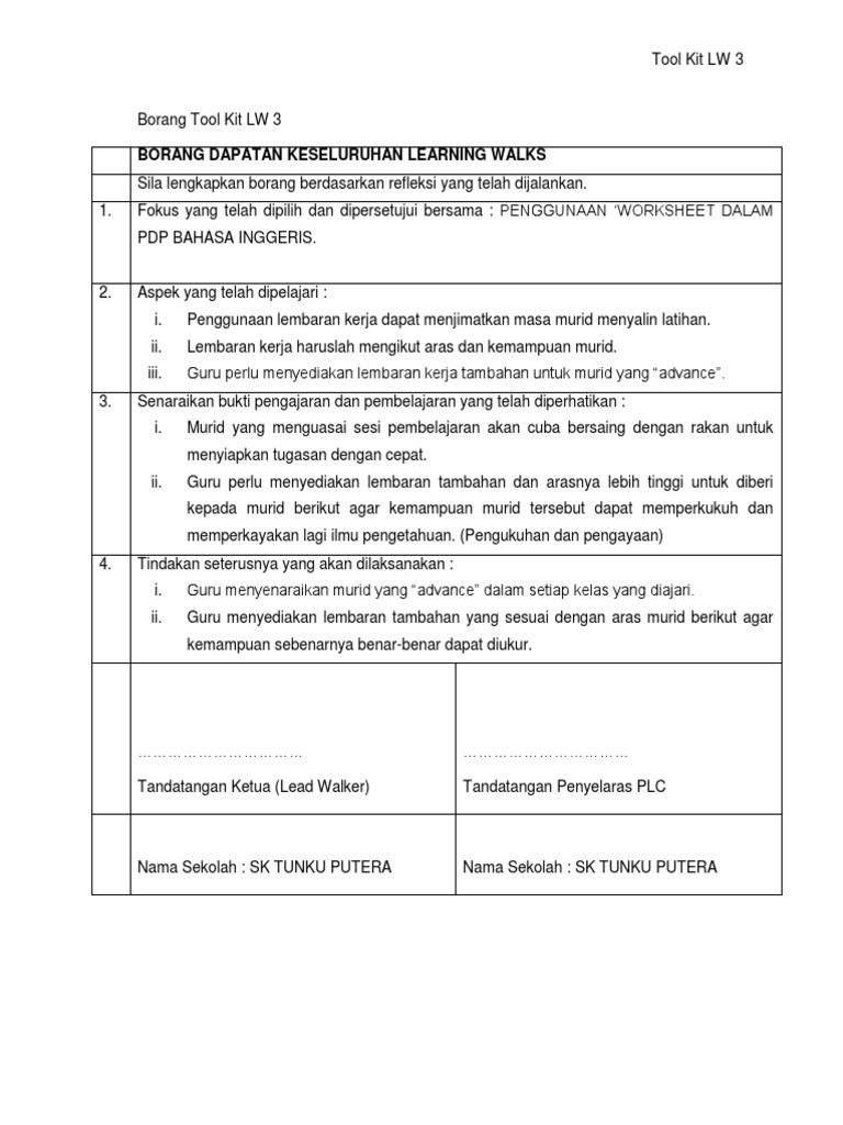 C ketua learning walks akan mencatatkan rumusan perbincangan dalam borang tool kit lw 3. Scribd es red social de lectura y publicación más importante del mundo. Ketua learning walks akan mencatatkan rumusan perbincangan dalam borang instrumen keseluruhan yang perlu dilakukan antara ahli lampiran 3. Fokus yang telah dipilih dan disetujui bersama.