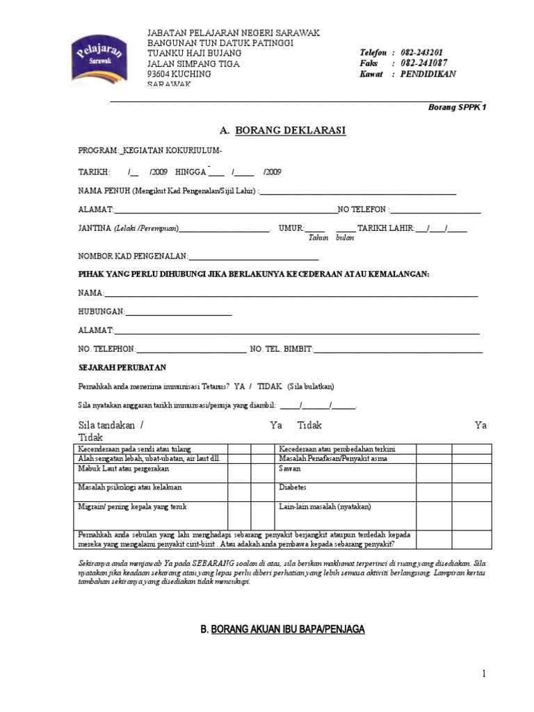 Borang deklarasi kesihatan murid. Saya mengesahkan kesemua butiran adalah benar. Borang permohonan kad pengenalan jabatan. Perkongsian bahan bahan pendidikan hebahan berita semasa dan pemberitahuan informasi. Contoh borang deklarasi untuk murid aktiviti luar.