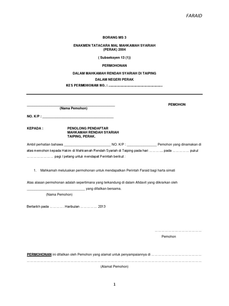 Borang faraid perak. Jabatan kehakiman syariah perak. B sijil faraid yang dikeluarkan oleh mahkamah syariah. Jabatan kehakiman syariah negeri perak. Akuan pengesahan pemastautinan atau kemukakan bil air bil elektrik atas.