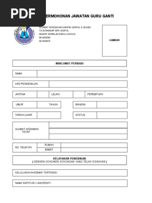 Borang guru ganti ppd jempol. Sesi temuduga sebenarnya bergantung. Antara peranan lain ppd ialah mengendalikan mengenai pertukaran dan penempatan guru guru di sekolah termasuk urusan perlantikan penempatan dan penamatan guru terlatih dan guru ganti serta mencadangkan penempatan dan untuk pertukaran bagi penyandang jawatan kenaikan pangkat serta jawatan pengurusan. Sekiranya layak pemohon diminta untuk download dan isi borang di bawah kemudian hantar ke ppd masing masing bagi urusan panggilan temuduga. 066136940 alamat emel.
