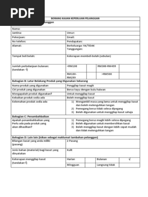 Keperluan dan jangkaan pelanggan yang perlu dicapai atau dipenuhi untuk mewujudkan kesetiaan pelanggan terhadap produk atau perkhidmatan yang ditawarkan. Borang soal selidik kajian kepuasan pelanggan terhadap kualiti perkhidmatan di majlis bandaraya alor setar kajian ini adalah bertujuan mengenalpasti tahap kepuasan pelanggan sebagai maklum balas bagi meningkatkan kualiti perkhidmatan yang disediakan oleh majlis bandaraya alor setar mbas kepada orang ramai. Borang soal selidik kajian kepuasan pelanggan terhadap perkhidmatan kaunter unit hasil utama hospital sungai buloh para pelanggan yang dihormati. Rm 12 000 bahagian b.