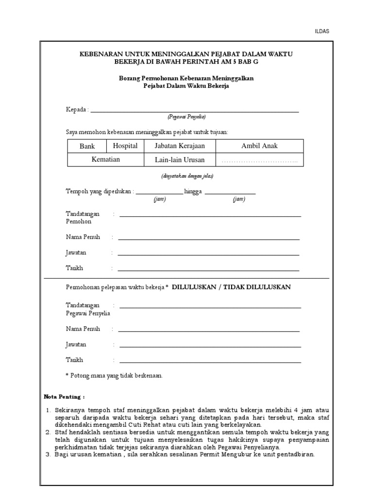 Mazuinda binti manshordin last modified by. Jarak perjalanan yang melebihi 240 km sehala dari ibu pejabat adalah layak dipertimbangkan elaun tambang gantian kapal terbang atau keretapi. Sekiranya tempoh pegawai meninggalkan pejabat dalam waktu bekerja melebihi 4 jam atau separuh daripada waktu bekerja sehari yang ditetapkan pada hari tersebut maka pegawai dikehendaki mengambil cuti rehat atau cuti lain yang berkelayakan. Borang permohonan kebenaran meninggalkan.