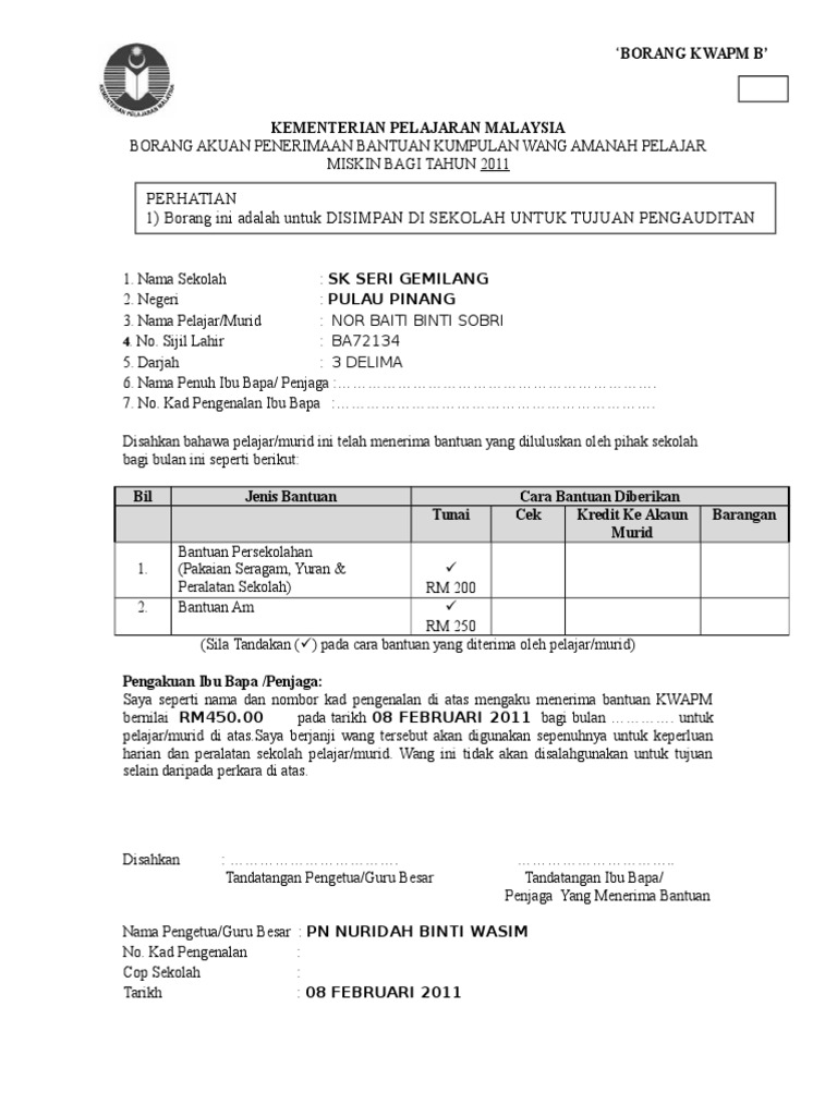 Kwsp 8 borang f penyata kiriman wang caruman tunggakan. Mohon pentadbir sekolah agar dapat muat turun borang lampiran b kwapm untuk disimpan disekolah bagi tujuan penguditan sebarang masalah hubungi en noraslin bin mohd dahan di tahian 019 7927679. Kepada guru guru atau pk hem yang memerlukan borang borang berkaitan kwapm sila klik pada pautan di bawah untuk proses muat turun. B borang ini perlu diisi oleh ibubapa penjaga murid pelajar miskin warganegara malaysia di sekolah rendah menengah kerajaan dan bantuan kerajaan.