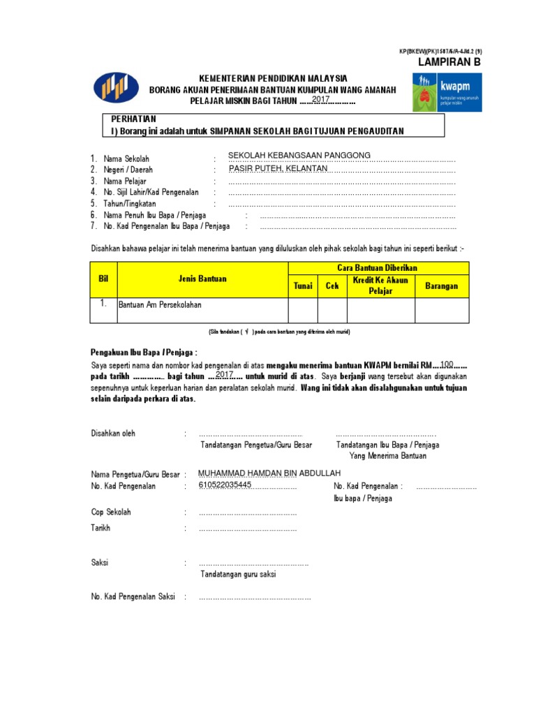 Borang kwapm lampiran b 2020. Senarai semak dokumen kwapm terkini. 13 mac 2020. Sila tandakan pada ruangan berkaitan. Maklumat penting borang permohonan bantuan kwapm untuk murid sekolah miskin darjah 2 sehingga darjah 6 beserta syarat kelayakan memohon.