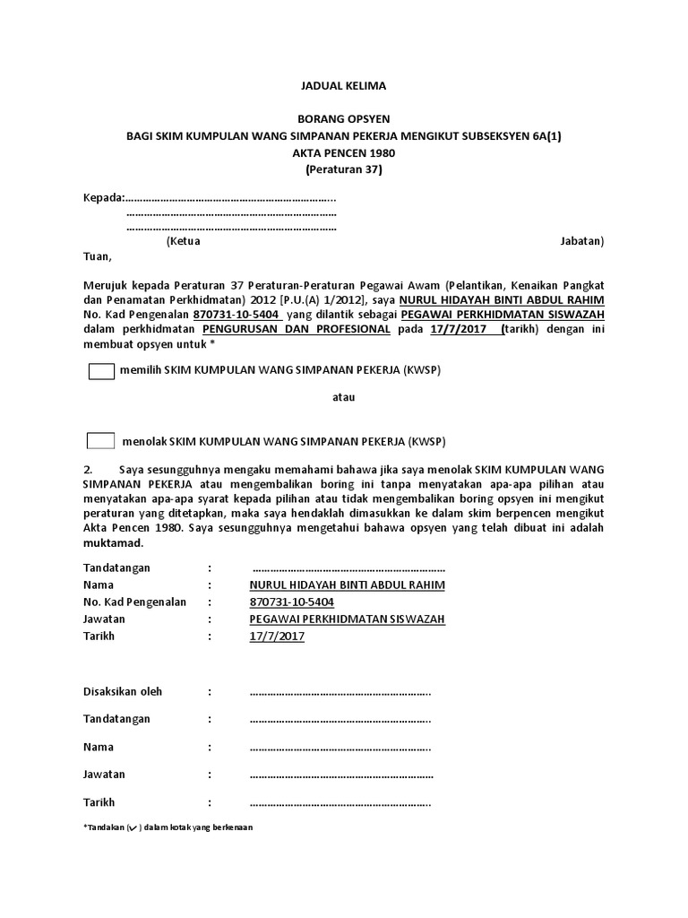 Lepas dpt surat pencen they r the one who must act. Kwsp saya juga masih dipotong tapi masa htr borang hari tu pgwi ckp boleh ambik keluar. Saya belum dapat bayaran lagi. Surat kelulusan pencen yang dikeluarkan oleh bahagian pencen jpa borang kwsp 3 pindaan untuk penghantaran melalui pos pengesahan cap ibu jari gagal salinan dokumen pengenalan bersama yang asal untuk tujuan pengesahan.