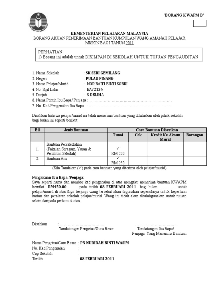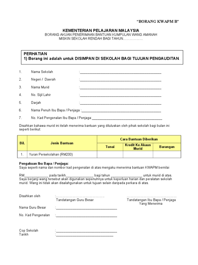 Borang lampiran b kwapm. Perhatian 1 borang ini adalah untuk disimpan di sekolah bagi tujuan pengauditan. Wan nasuha wan mohamad created date. Maklumat penting borang permohonan bantuan kwapm untuk murid sekolah miskin darjah 2 sehingga darjah 6 beserta syarat kelayakan memohon. Kementerian pelajaran malaysia borang akuan penerimaan bantuan kumpulan wang amanah miskin sekolah rendah bagi tahun.