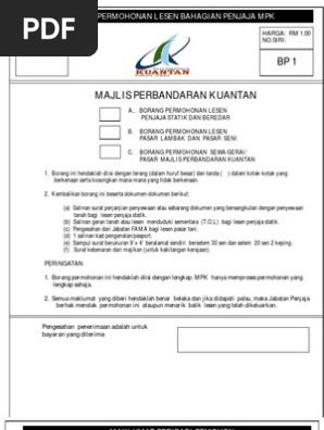 Borang permohonanboleh didapati di kaunter bayaran jabatan kawalan perniagaan dan pelesenanlaman web majlis perbandaran kuantansebarang pertanyaan bolehlah dirujuk kepada bahagian pelesenan majlis perbandaran kuantantel. Senarai jenis pelesenan permit sementara. 1 salinan pendaftaran syarikat perniagaan pertubuhan borang 9 49 atau borang d beserta maklumat perniagaan pemilik 1 salinan kad pengenalan pasport pemohon. Anda perlulah berumur 18 tahun ke atas dan warganegara malaysia.