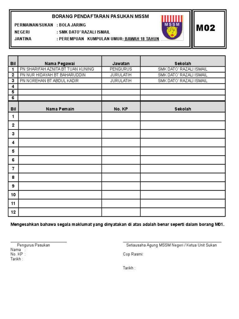 Pindaan dibenarkan pada bulan ke 3 ansuran sekiranya bulan ke 3 ansuran tersebut jatuh dalam tahun 2020. Borang pendaftaran pasukan mssm permainan sukan. Borang pendaftaran m01 m02 r01 dan r02 untuk guru. M02 bil nama pegawai jawatan sekolah 1 2 3 4 5 6 bil nama pemain no.