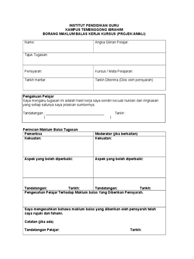 Institut pendidikan guru kampus temenggong ibrahim borang maklum balas kerja kursus ppg pismp ppismp nama pelajar. Januari 2019 hingga jun 2020. Maklum balas maklum balas sila lengkapkan borang dibawah dengan maklumat yang tepat bagi memudahkan pihak kami menghubungi anda. Lebih berkeyakinan mengajar modul berkenaan menjalankan tugas berkaitan mengaplikasi apa yang dipelajari berbanding sebelum ini.