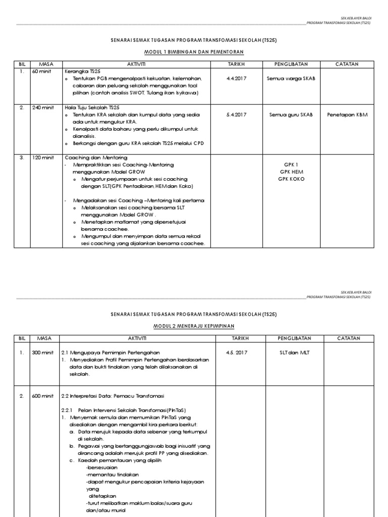 Kamu dikehendaki menilai hasil kerja rakan atau kumpulan mengikut rubrik yang telah disediakan. Apakah kegunaan bmm ini. Sebagai pps peserta mengenal pasti tahap perkembangan semasa program tranformasi ts25 sekolah masing masing berdasarkan data dan bukti daripada tugasan ts25 modul 1 modul 2 dan modul 3. Melalui ts25 adalah diharapkan sekolah yang terlibat berupaya mengaplikasikan amalan terbaik dalam pelaksanaan pengurusan dan kepimpinan serta pedagogi dalam pembelajaran dan pengajaran pdp selari dengan hasrat yang terkandung dalam pelan pembangunan pendidikan malaysia pppm 2013 2025.