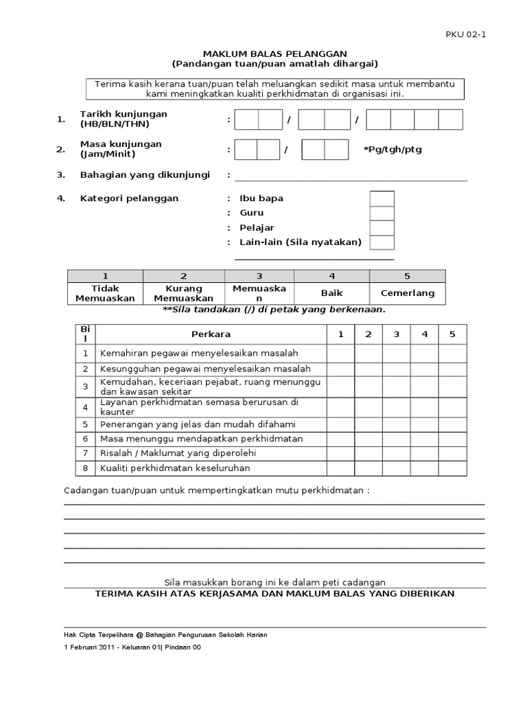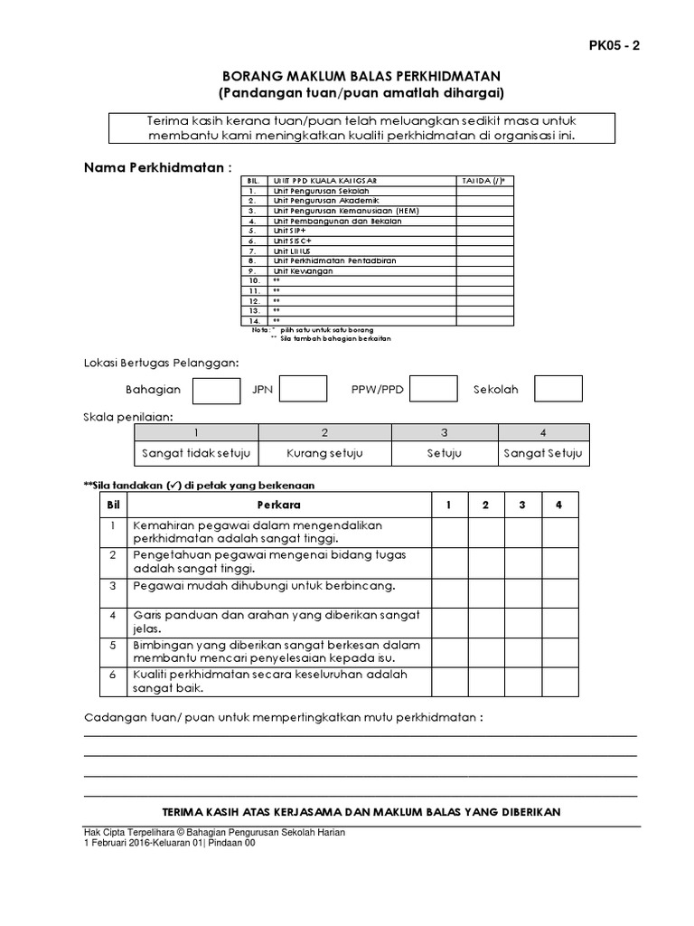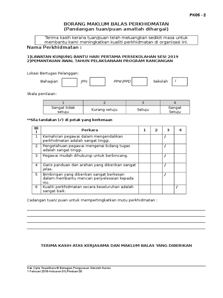 Borang maklum balas perkhidmatan. Pk05 2 borang maklum balas perkhidmatan pandangan tuan puan amatlah dihargai terima kasih kerana tuan puan telah meluangkan sedikit masa untuk membantu kami meningkatkan kualiti perkhidmatan di organisasi ini. Selamat datang ke borang maklumbalas dan pertanyaan dalam talian. Kajian ini adalah bertujuan mengenalpasti tahap kepuasan pelanggan sebagai maklumbalas bagi meningkatkan kualiti perkhidmatan yang disediakan oleh jabatan bendahari negeri sabah. Borang maklum balas perkhidmatan pelanggan kaunter b melayu english berikan penilaian anda untuk pengalaman perkhidmatan yang lebih baik pada masa hadapan.