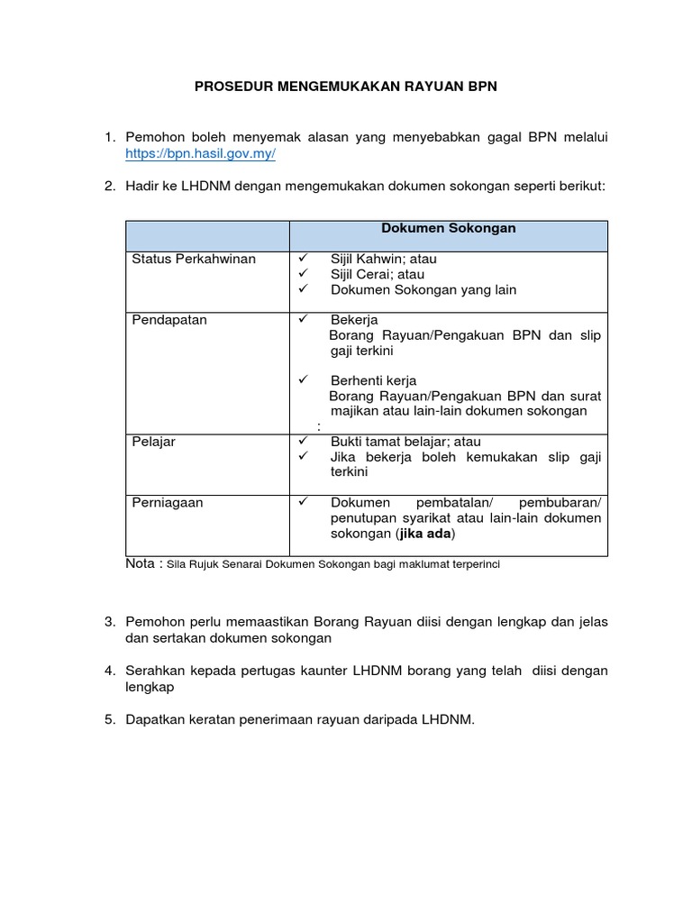 Borang rayuan pengakuan bpn dan slip gaji terkini berhenti kerja borang rayuan pengakuan bpn dan surat majikan atau lain lain dokumen sokongan. Borang permohonan boleh dimuat turun dari pautan https bpn hasil gov my. Borang permohonan pembatalan bpn 2 0 online. Kerajaan malaysia borang pembatalan permohonan bantuan prihatin nasional bpn maklumat pemohon nama seperti di mykad a2 nombor mykad no.
