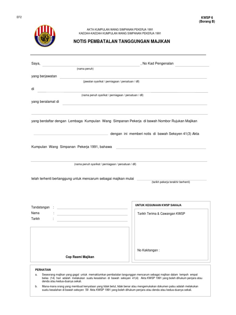 Kwsp 6 borang b notis pembatalan tanggungjawab majikan. 1 kumpulan wang simpanan pekerja panduan mengisi borang kwsp 4 a bagi permohonan pembatalan penamaan 1. Surat tawaran kerja 1. Senarai semak permohonan bayaran balik sistem insurans pekerjaan sip senarai semak permohonan bayaran balik sistem insurans pekerjaan sip.