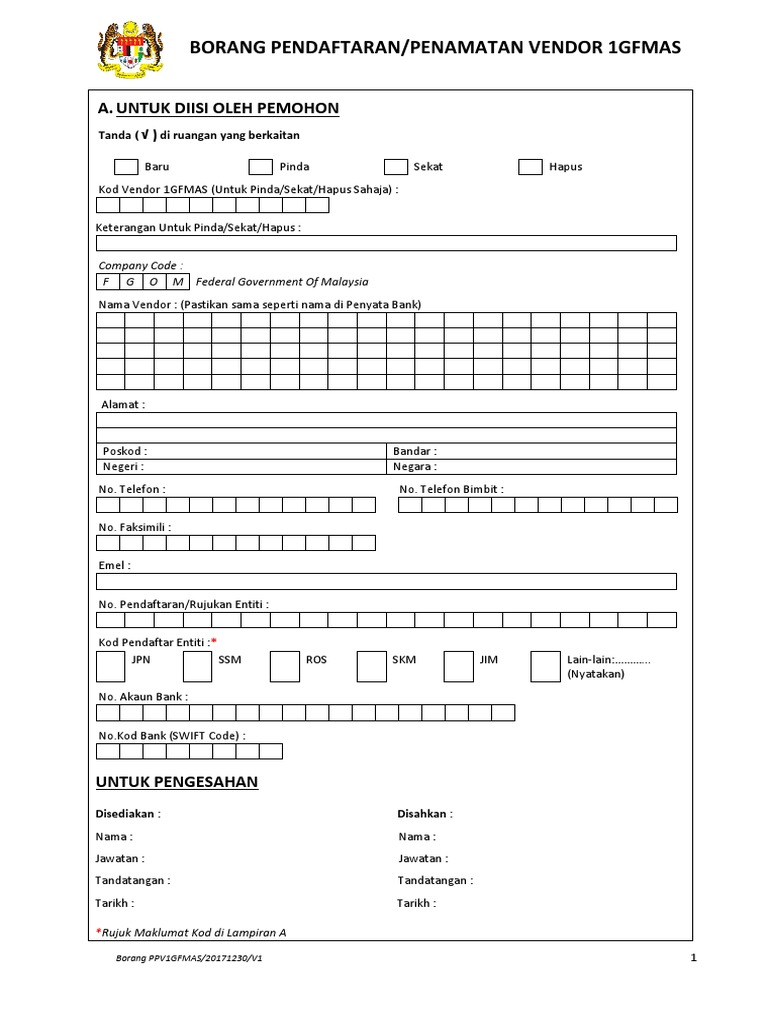 Kpm kementerian pelajaran malaysia 2. T tangan nota pegawai penyedia dan pelulus hendaklah dilakukakan oleh pegawai yang berlainan. Borang ppv1gfmas 20171230 v1 3 borang pendaftaran penamatan vendor 1gfmas lampiran a maklumat kod untuk rujukan 1. Surat pemakluman sistem evendor garis panduan pengisian borang borang pendaftaran dan penamatan pembekal sistem evendor.