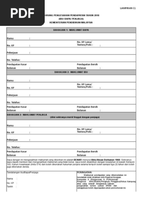 Lampiran c1 111 5 2 borang penetapan peranan pegawai tadbir pengurusan prestasi agensi lampiran c2 112 5 3. Garis panduan bantuan awal persekolahan 2018 28 bahagian kewangan kementerian pendidikan malaysia lampiran c1 borang pengesahan pendapatan tahun 2018 ibu bapa penjaga kementerian pendidikan malaysia bahagian 1. Portal rasmi kementerian pendidikan malaysia. Sekiranya ibu bapa penjaga tidak mempunyai dokumen di atas mereka perlu melengkapkan borang pengesahan pendapatan seperti di lampiran c1.
