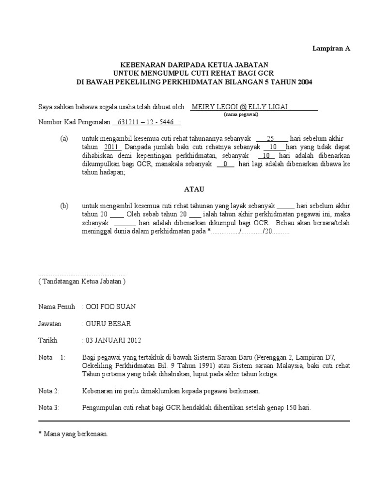 Borang pengumpulan cuti rehat 150 hari. Kebenaran gantian cuti rehat melebihi 150 hari digunakan sebagai cuti rehat pada tahun persaraan berdasarkan surat pekeliling perkhidmatan bilangan 2 tahun 2017 2. Jumlah sebanyak hari adalah dipohon untuk digunakan sebagai cuti rehat sebelum bersara pada 20 disahkan bahawa perkiraan gcr seperti di lampiran jpa bp umum b02 pin adalah betul dan tepat. Pengumpulan cuti rehat bagi gcr hendaklah dihentikan setelah genap 150 hari. Gawal yang tertaklljk al dawan bistem saraan baru perenggan 2 l an wran d pekeliling perkhidmatan bil.