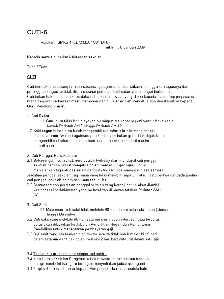 Borang permohonan cuti sakit melebihi 90 hari. Cuti sakit cuti sakit diberi oleh ketua jabatan atau kuasa tertentu apabila disahkan sakit oleh pegawai perubatan berdaftar lembaga perubatan atau panel doktor kerana tidak sihat untuk menjalankan tugas jawatannya. Cuti sakit 90 hari setahun kerajaan dan swasta sijil sakit swasta tidak melebihi 15 hari setahun pesakit luar dan 180 hari pesakit dalam dimasukkan ke dalam wad boleh diberi 90 hari lagi dengan kuasa tertentu pegawai berkenaan boleh menghabiskan cuti rehat yang masih ada. I menggunakan kemudahan cuti rehat sebelum genap 28 hari tempoh pemangkuan kecuali penggunaan kemudahan cuti rehat atas sebab sebab kecemasan serta cuti sakit secara terkumpul yang tidak melebihi daripada 6 hari bekerja. Jika lebih perlu dapatkan kelulusan daripada ketua setiausaha kementerian pendidikan malaysia.