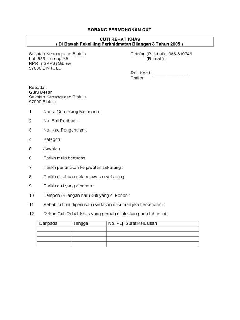 Borang hendaklah diisi oleh pemohon dalam tiga salinan. Permohonan cuti rehat am 42 pin2 91 doc author. Pp 5 2014 borang cma 2. 10 29 2013 3 36 50 pm.