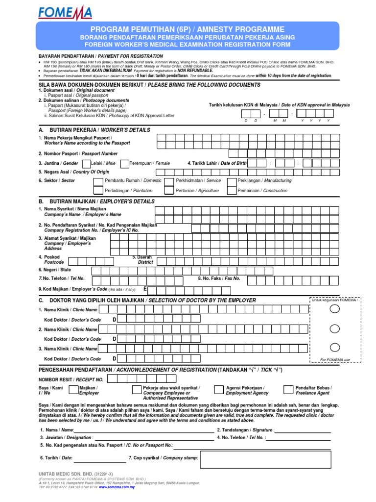 Foreign worker medical examination registration form. Registered online for fomema at https portal fomema my make sure passport expiry must exceed than next renewal permit expiry date if not you need to renew passport first before can proceed with immigration validity for fomema results is within 30 days for you to proceed with immigration within the validity period. Formerly known as pantai fomema systems sdn. Borang pendaftaran pemeriksaan perubatan pekerja asing foreign worker s medical examination registration form bayaran pendaftaran payment for registration rm 201 40 perempuan atau rm 190 80 lelaki termasuk 6 gst dalam bentuk draf bank kiriman wang atau cimb clicks dibayar atas nama fomema sdn.