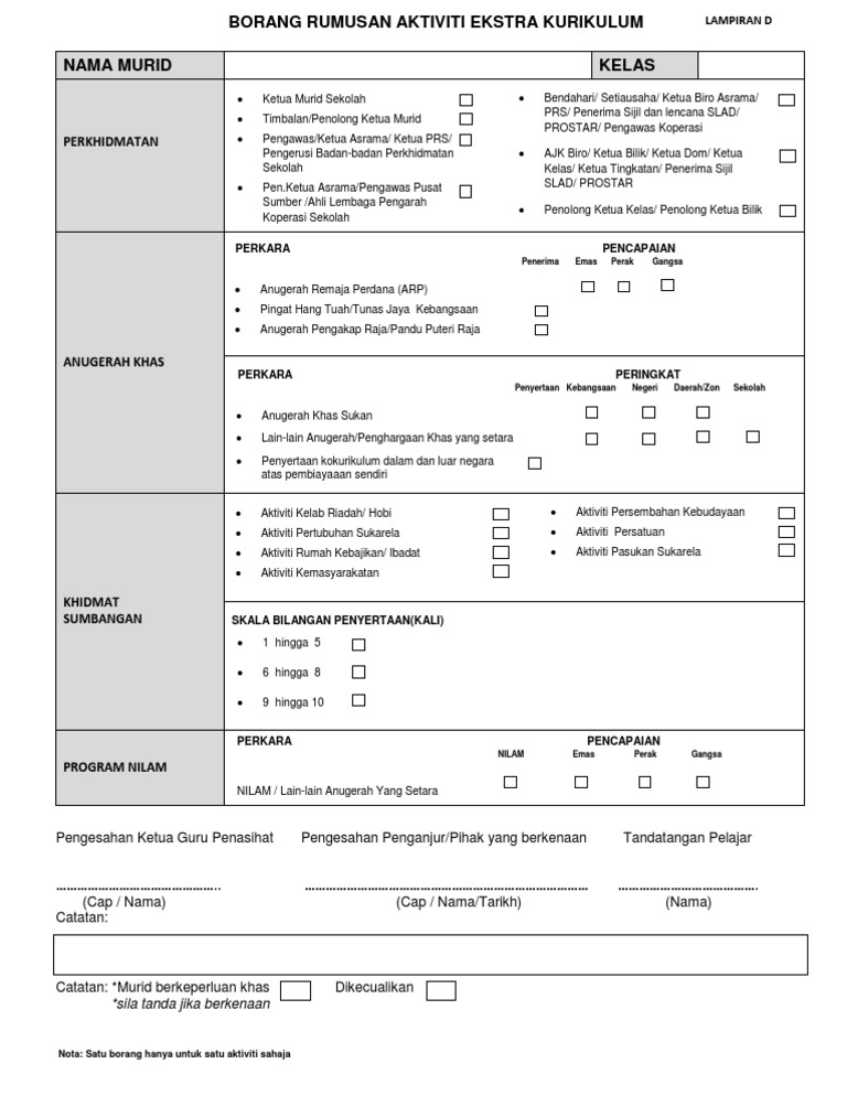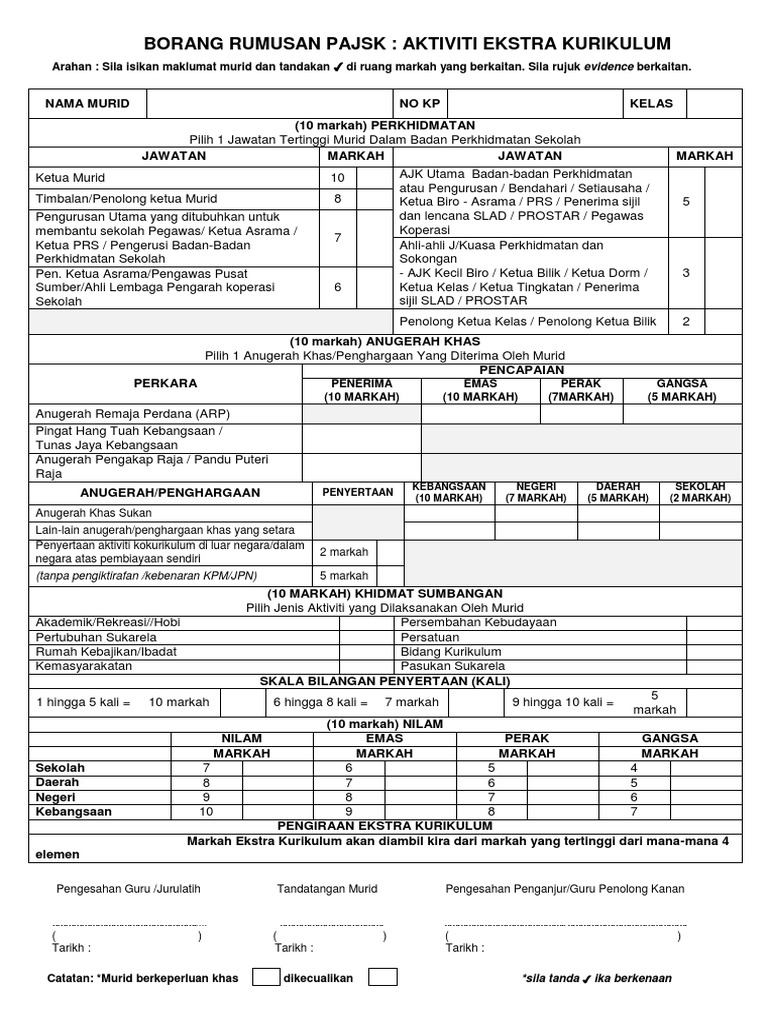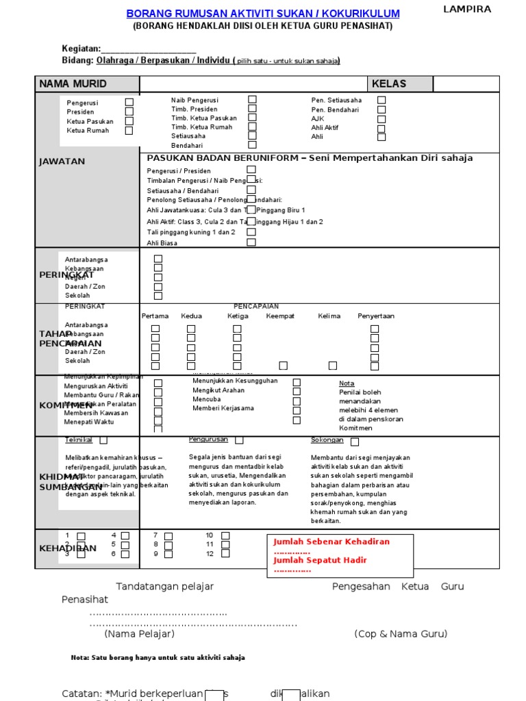 Borang rumusan aktiviti sukan kokurikulum borang hendaklah diisi oleh ketua guru penasihat kegiatan kelab catur bidang. 2019 pt lembaga hasil dalam negeri malaysia borang borang nyata perkongsian liabiliti terhad di bawah seksyen 77 a akta cukai pendapatan 1967 borang ini ditetapkan di bawah seksyen 152 akta cukai pendapatan 1967 isikan ruangan berikut liabiliti terhad. Sistem aplikasi pentaksiran aktiviti jasmani sukan dan kokurikulum pajsk adalah sistem yang dibangunkan khas untuk membantu guru guru khususnya penolong kanan kokurikulum menjalankan pentaksiran pajsk dengan lebih mudah dan efisen mengikut format dan garis panduan yang telah ditetapkan oleh bahagian kokurikulum dan kesenian kementerian pendidikan malaysia. Olahraga berpasukan individu pilih satu untuk sukan sahaja teknikal melibatkan kemahiran khusus referi pengadil jurulatih pasukan konduktor pancaragam jurulatih kadet dan lain lain yang berkaitan dengan aspek teknikal.