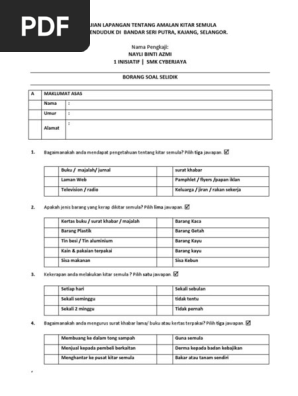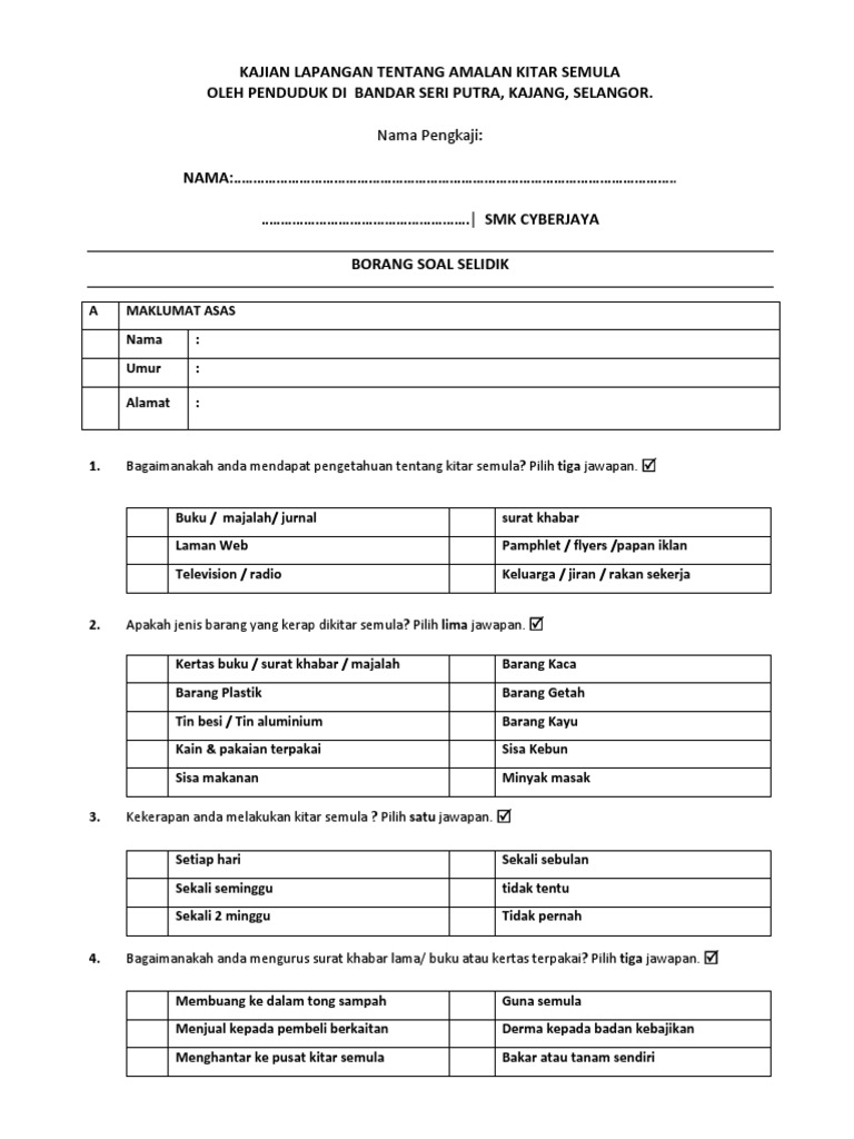 Doc borang soal selidik ikhmal alif academia edu. Related posts to contoh borang soal selidik amalan kitar semula contoh borang soal selidik amalan kitar semula 2017 03 15t22 05 00 07 00 rating. Kitar semula merupakan salah satu alternatif yang dianggap senang untuk dipraktikkan. Soal selidik sikap alam sekitar dan amalan kitar semula diubahsuai daripada kajian lepas dan digunakan sebagai alat kajian.