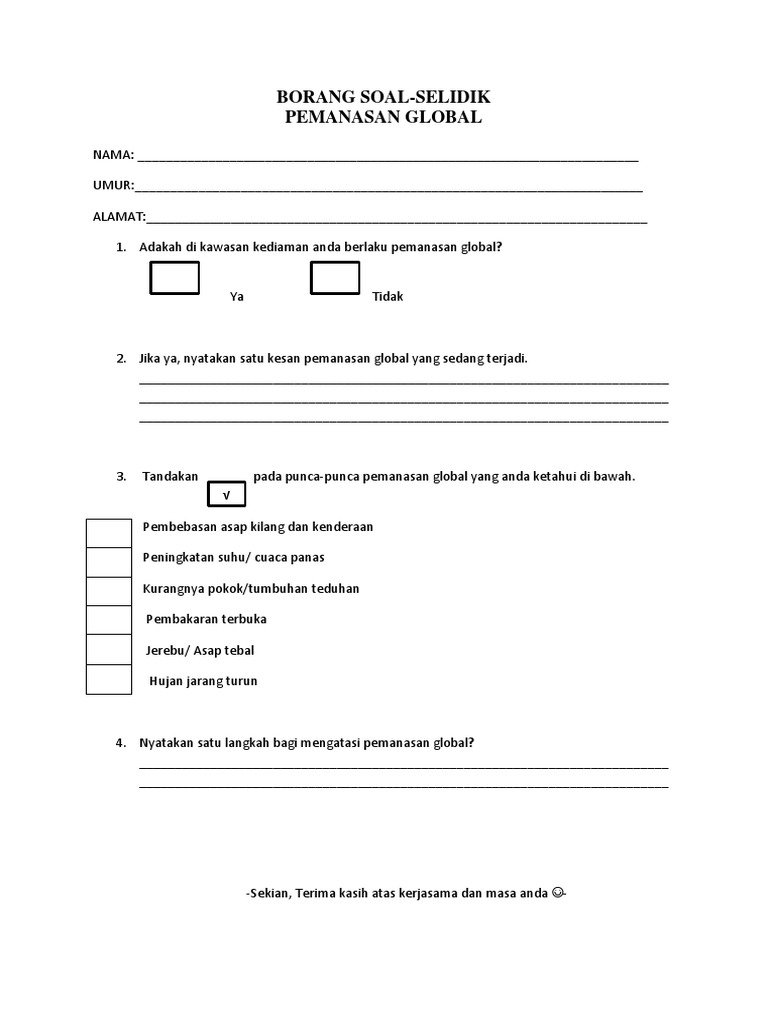 Kami juga telah dibimbing oleh guru untuk menyediakan borang soal selidik bagi menemu bual orang ramai. Pemanasan global berlaku apabila gas gas seperti karbón monoksida karbón dioksida kloro flourokarbon cfc metana dan nitros oxida menyerap sinaran daripada matahari dan mengeluarkan semula sinaran tersebut suhu purata atmosfera bumi akan meningkat gas gas ini juga menyerap tenaga haba yang dikeluarkan daripada sistem atmosfera bumi ini secara kolektif akan meningkatkan lagi suhu purata. Soal selidik geografi tingkatan 2. Pemanasan global peningkatan suhu atmosfera bumi secara berterusan akibat daripada kesan rumah hijau.