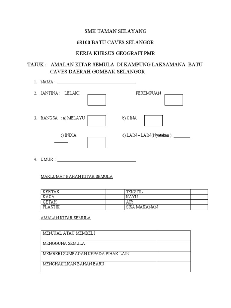 Kajian amalan kitar semula. Borang soal selidik tugasan geografi tingkatan 3 tajuk. Sekolah rendah pmr spm stpm diploma ijazah 4 tempoh tahun menetap di pengkalan. 3 soal selidik saya juga telah menyediakan 20 borang soal selidik yang perlu diisi oleh penduduk kampung yang akan menjadi responden terhadap kajian yang akan dilakukan.