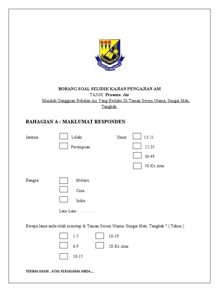 Borang soal selidik. Contoh borang soal selidik contoh untuk dijadikan panduan contoh contoh borang soal selidik. Ini bertujuan untuk mengkaji tentang sejauhmanakah penerimaan masyarakat terhadap perubatan tradisional perbomohan melayu dalam konteks hubungan etnik. Sekolah rendah pmr spm stpm diploma ijazah 4 tempoh tahun menetap di pengkalan. Borang soal selidik ini dan memberikan pandangan dan cadangan tambahan sekiranya ada.