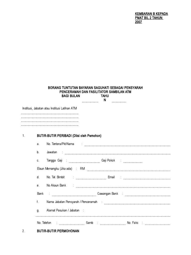 Jumlah besar tuntutan bulanan di para 1 di atas adalah melebihi kelayakan saya seperti ditetapkan di perenggan 2 dalam pekeliling perbendaharaan bil 2 tahun 2005 dan saya. Kadar asas mengikut kelayakan akademik fasilitator swasta diploma sijil sarjana muda sarjana ph d rm80 00. Pengesahan kelulusan ketua jabatan 4 1 ulasan ketua jabatan 4 2 pengesahan ketua jabatan i saya mengesahkan tuntutan di atas adalah benar ii di sahkan bahawa pegawai ini adalah seorang pensyarah penceramah sambilan. Borang maklumat penceramah fasilitator jemputan.