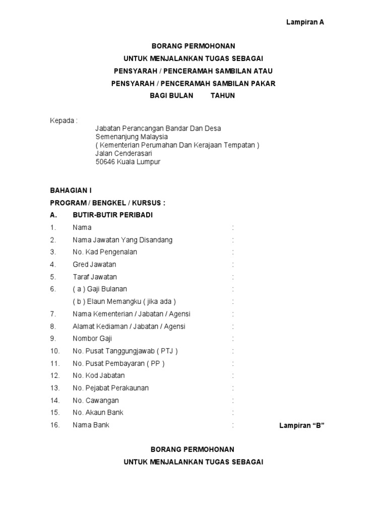 Tandatangan ketua jabatan nama. 1 1 borang tuntutan penceramah lampiran b di wp 1 8 1 2 surat jemputan sebagai penceramah 1 3 salinan akaun bank. Untuk menjalankan tugas sebagai. Kadar pegawai tetap kontrak sementara sambilan dan sangkut yang memberi ceramah sambilan atau menjadi fasilitator sambilan kumpulan perkhidmatan kadar bayaran saguhati had maksimum sebulan pensyarah penceramah sambilan fasilitator sambilan kumpulan pengurusan tertinggi rm 300 00 sejam rm 100 00 sejam tidak melebihi 1 2 daripada gaji.