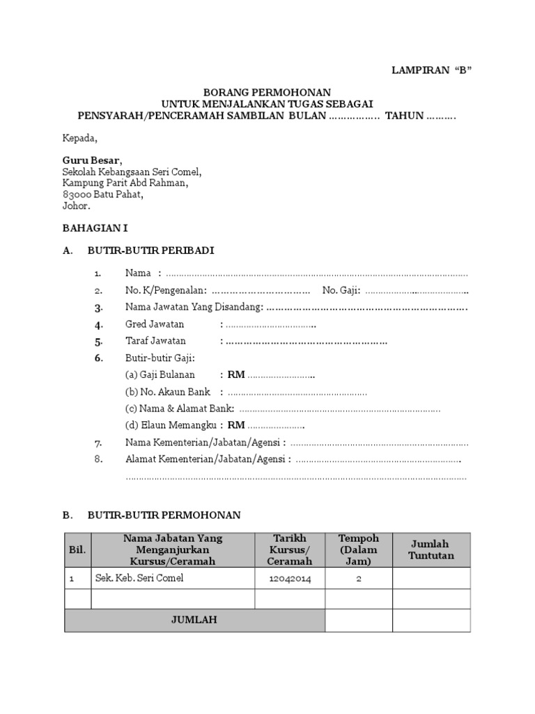 Borang tuntutan penceramah sekolah. Borang tuntutan penceramah 1. Semak penyata tuntutan dengan surat jemputan ceramah atau surat panggilan samada pegawai ini sebagai penceramah atau urusetia pegawai tidak layak menuntut bayaran penceramah jika beliau sebagai urusetia. Maklumat pemohon nama pemohon seperti di kad pengenalan no kad pengenalan pasport jawatan kategori. Borang bayaran saguhati pensyarah penceramah fasilitator moderator sambilan nama program.