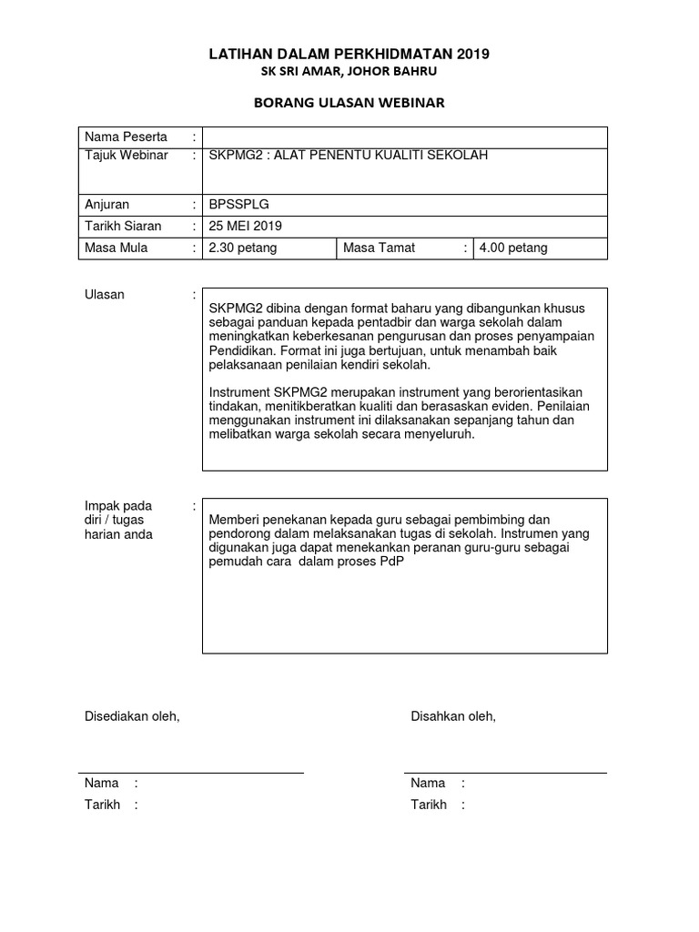 Borang ulasan webinar splkpm. Tatacara mengikuti webinar web seminar kementerian pendidikan malaysia tahun 2019 login spl kpm klik modul individu login id password. Naratif baharu amalan pendidikan anjuran. 10 04 2019 masa mula. Download borang webinar splkpm april 06 2020 tentu kawan kawan tercari cari borang untuk dijadikan sebagai bukti kita telah mengikuti webinar dalam splkpm.